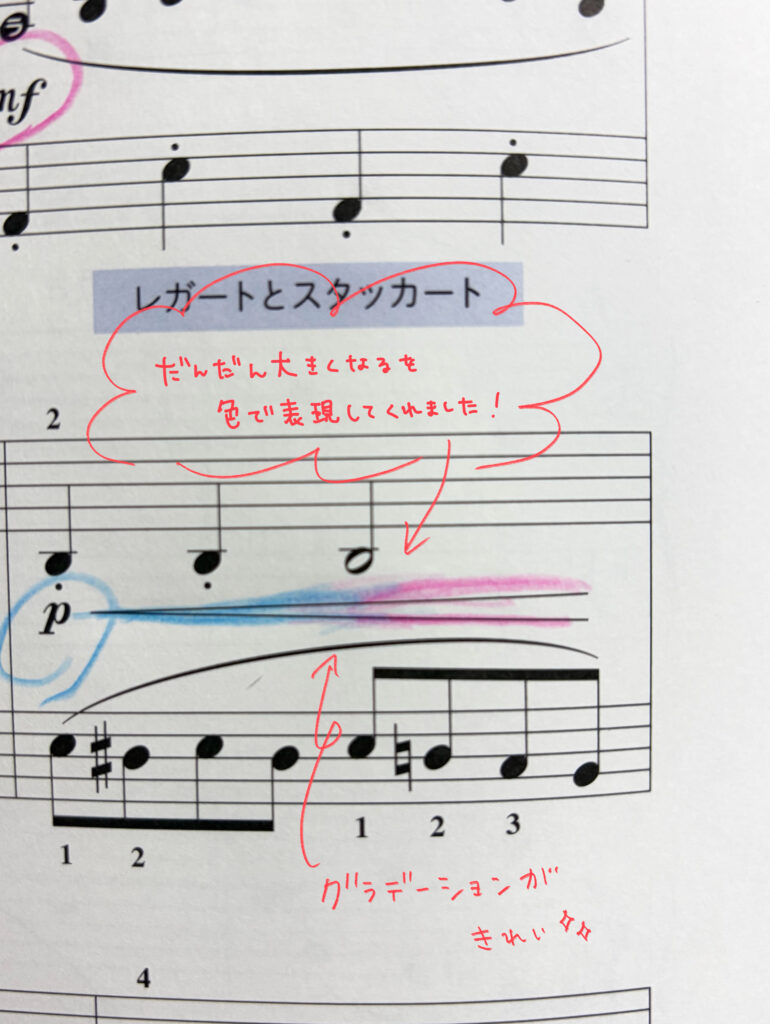 私なら1色で線をなぞってしまいそうなところを、生徒さんは自分の感覚で色を選び、クレッシェンドの“だんだん強くなる”感じを視覚的に表してくれました。